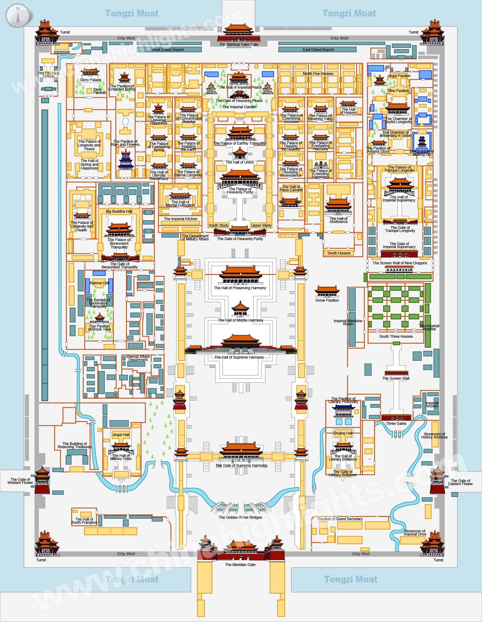 - Route: Hall of Supreme Harmony → Hall of Central Harmony → Hall of Preserving Harmony → Palace of Compassion and Tranquility → Palace of Longevity and Health → Palace of Heavenly Purity → Hall of Union → Palace of Earthly Tranquility → Palace of Eternal Longevity → Palace of Gathered Elegance → Imperial Garden → Corner Tower